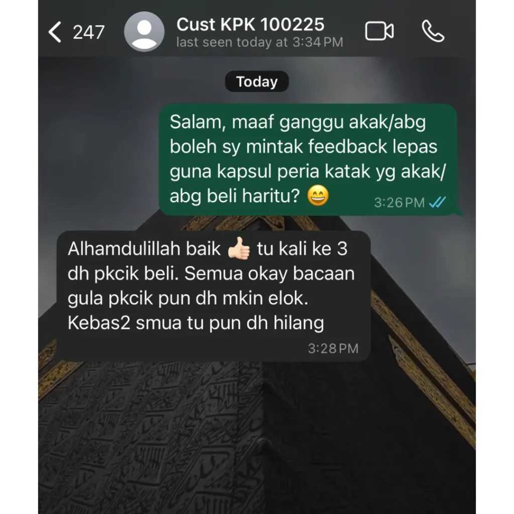 KETIGA : Anda bagi peluang untuk cuba Kapsul Peria Katak sekarang. Amalkan 1 atau 2 biji sehari sebelum atau selepas makan. Nampak cergas seperti muda dari biasa. Kengkawan akan mula perasan dan akan tanya. Produk apa yang anda guna.